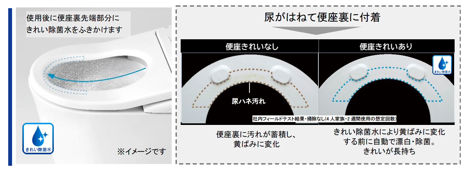 【便座裏の尿汚れを使うたびにしっかり漂白・除菌】