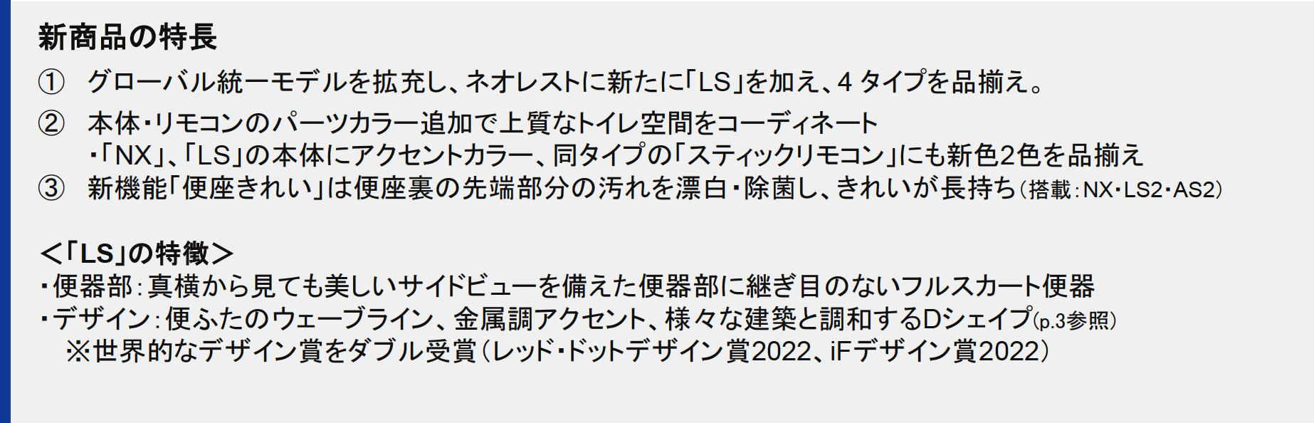 2022年、「世界をリードする新しいネオレスト」をコンセプトに開発された「LS」は便器部に継ぎ目がないフルスカート形状です。空間における他のアイテムとの調和や質感を追求し、世界で求められるデザインとテクノロジーの融合を高いレベルで実現しました。同時発売するTOTOのフラッグシップモデル「NX」、直線の美しさを活かした端正なデザインの「AS」、優しい丸みを帯びたデザインの「RS」など、それぞれ異なる テイストでレストルーム空間を演出します。4タイプともに世界を代表するデザイン賞において既に高い評価を得ています(詳しくは3月24日発信:レッド・ドットデザイン賞2022、6月7日発信:iFデザイン賞2022のニュースリリースをご参照ください)。また、新機能として便座裏に「きれい除菌水」のミストをかけてきれいを長持ちさせる「便座きれい」を追加しました。
