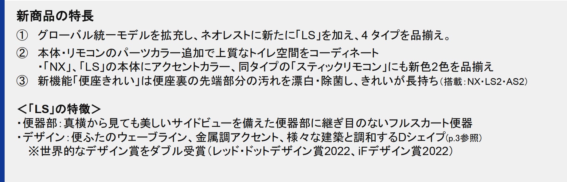 グローバル統一モデルを拡充、「LS」を新発売 〜デザインとテクノロジーの融合がさらに進化。美しく上質なレストルーム空間を提案〜