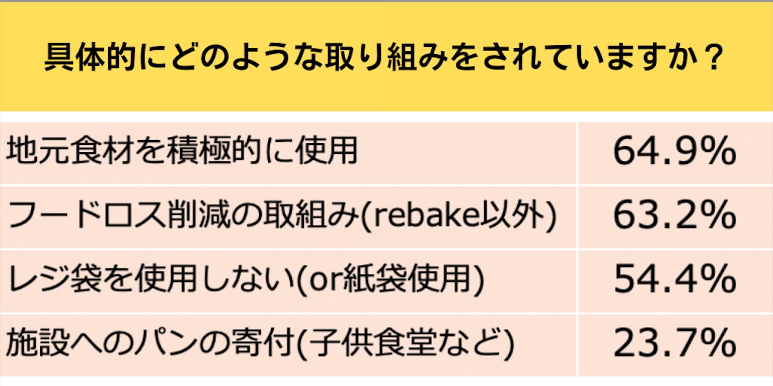 rebakeに登録しているパン屋さんを対象に、SDGsを意識した店舗運営をされていますかという問いに対し、94.9%が「はい」と回答。内容としては、地元食材を積極的に利用する、フードロス削減の取組み(rebakeへの出店以外で)、レジ袋を使用しない(or紙袋を使用)という3つの項目が上位を占めました。