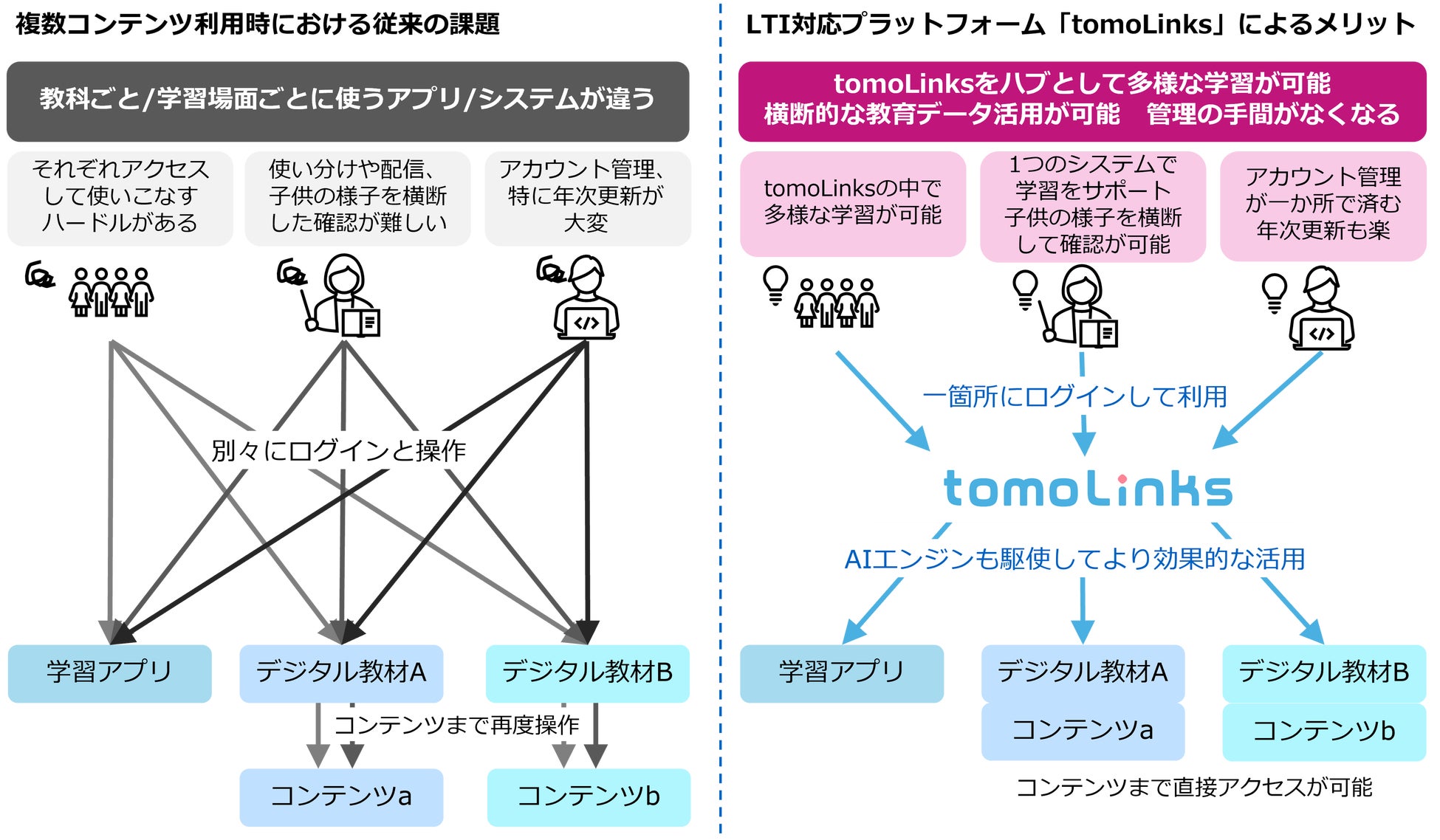 このことから、「tomoLinks」では、各コンテンツのアカウント情報を一括管理し、各コンテンツでの学習データを横断して把握、蓄積できる学習プラットフォームとして利活用できるよう、LTIに対応しました。これにより、「tomoLinks」の画面上でシームレスに様々な教材へのアクセス、操作やデータの一括管理ができるようになり、利便性の向上と、教育データ利活用を推進します。またLTIに対応した教材はすべてAI分析できる教育データとして取り扱うことができるため、学習をより個別最適化することが可能になります。