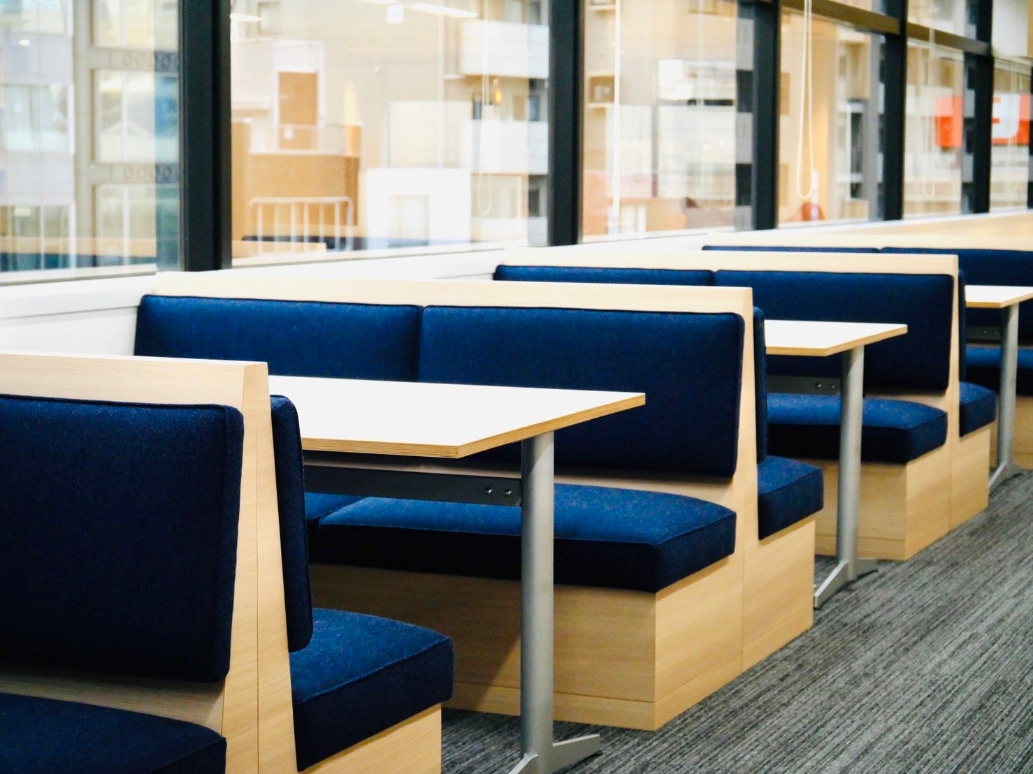 メインエリアに50席を配置するほか、商談ブース・スタンディングスペース・テーブル席などを配置