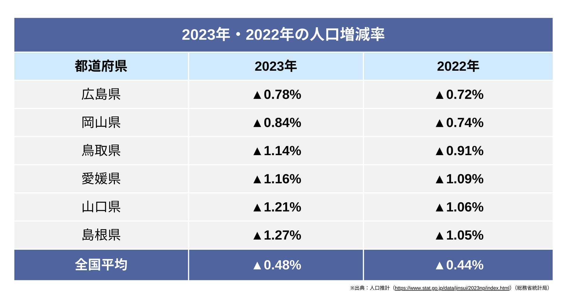 近年の人口減少・少子高齢化に伴い、新築住宅の件数は年々減少傾向を辿っています。特に同社が事業展開する、中国地方及び愛媛県では人口減少率が高い傾向にあります。総務省統計局の2023年度の人口推計によると中国地方5県と愛媛県全てで前年度と比べて人口減少率が拡大し、全国平均を上回る結果でした。(※1)