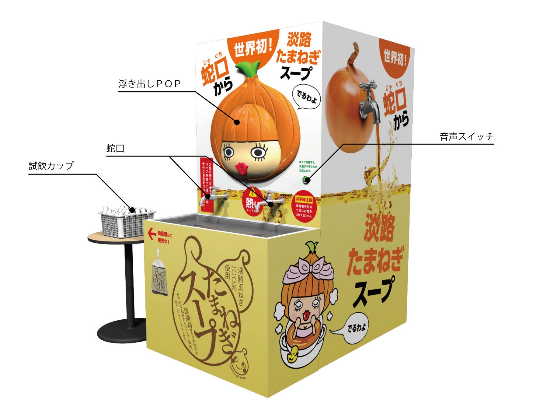 2つの蛇口から注がれる100%淡路島産の玉ねぎを使用したスープは、コンソメ味。機器の外観イメージは、淡路ハイウェイオアシスのゆるキャラ「淡路タマ子さん」を立体的に再現しています。スイッチを押すとお話しする、おもしろ機能を搭載しております。