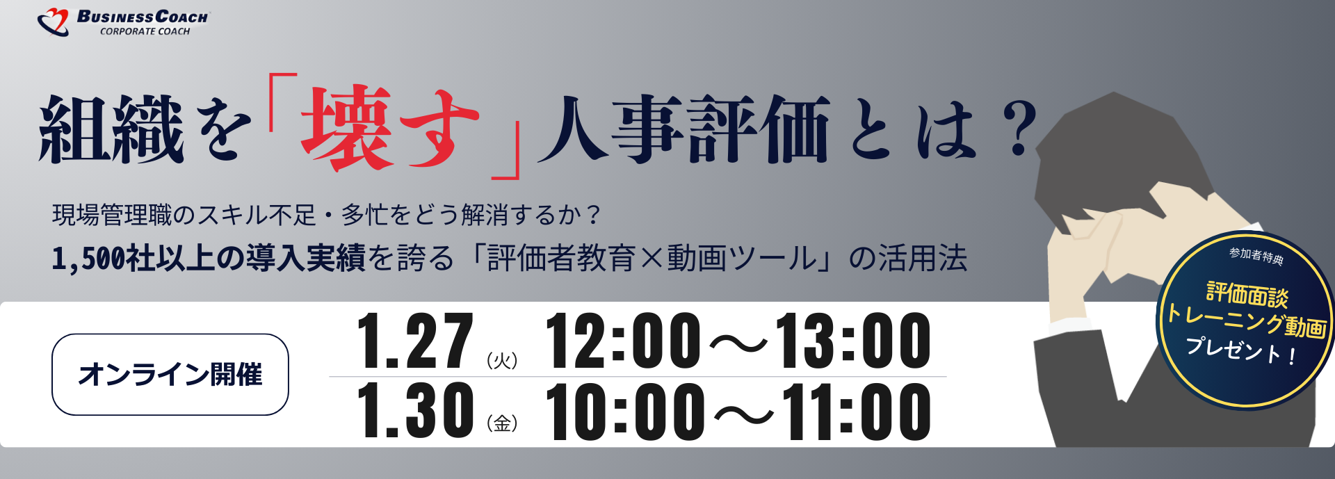 ビジネスコーチ株式会社(本社:東京都港区、代表取締役社長:細川 馨、東証グロース:9562)の子会社であるコーポレートコーチ株式会社(本社:東京都港区、代表取締役社長:森川 駿、以下当社)は、1月27日(火)、1月30日(金)に、無料セミナーを開催いたします。「評価者教育×動画ツール」の活用法を余すことなくお伝えいたします。