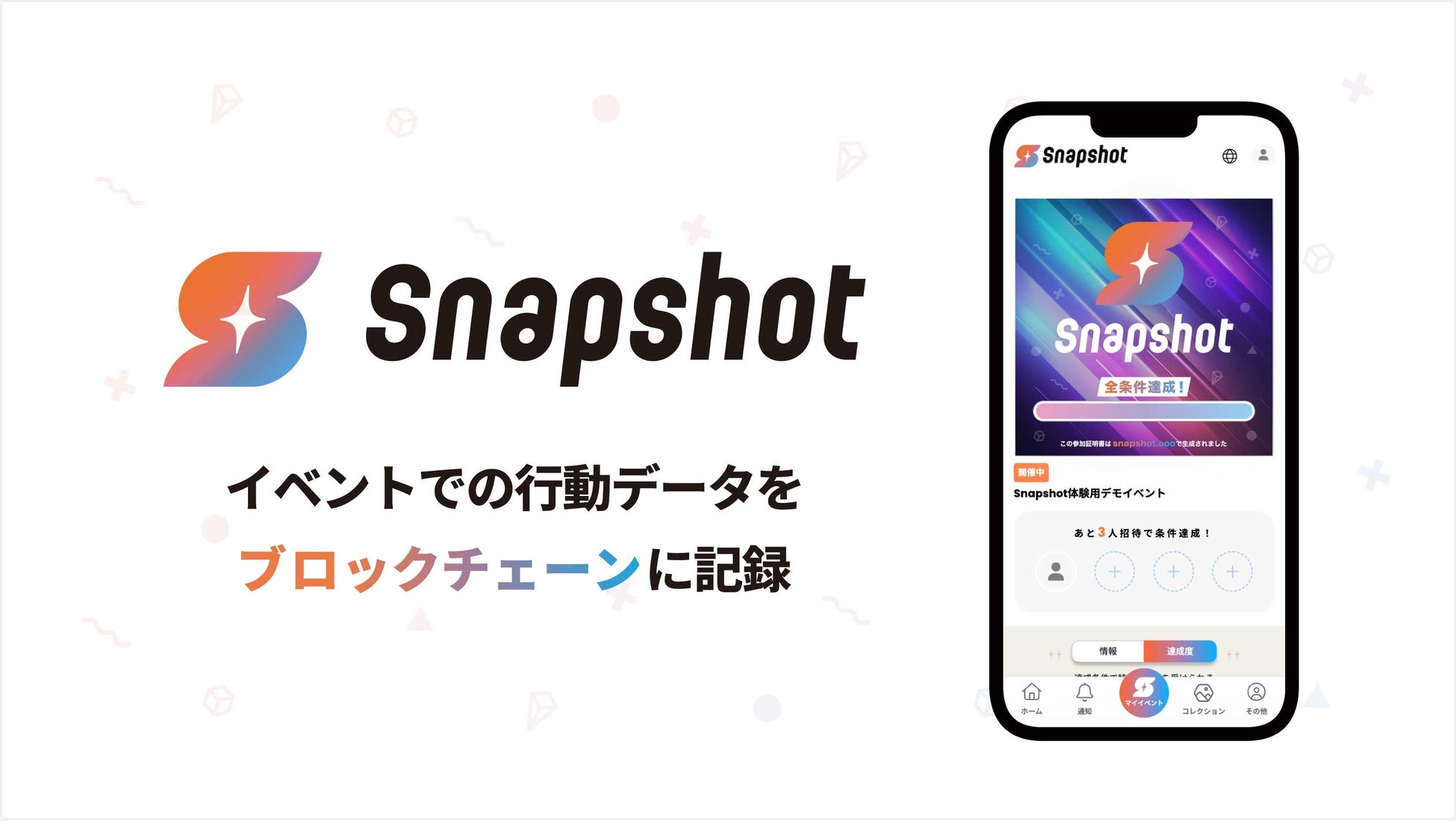 Snapshotとは、イベントにおける「参加記録」「ミッション設定」「特典受け取り」をワンストップで実現するイベント主催者向けサービスです。サービス内での行動履歴はブロックチェーンに記録され、改ざんが不可能な記録として、分析などに活用できます。