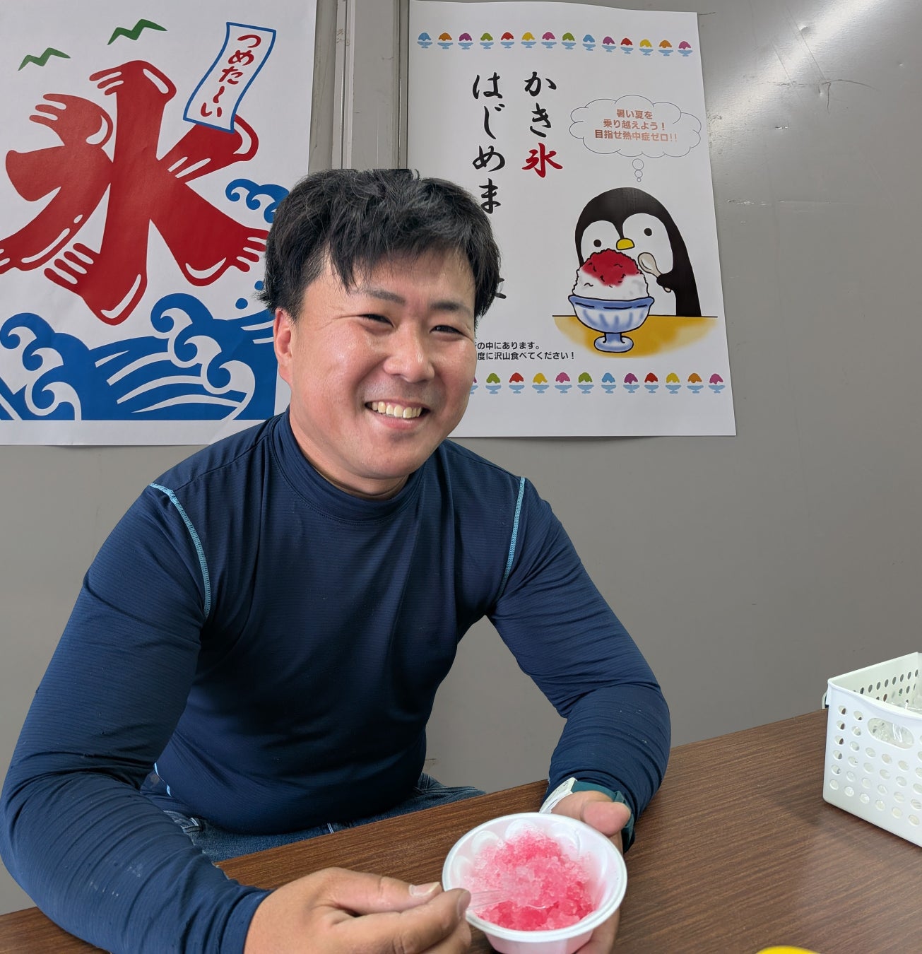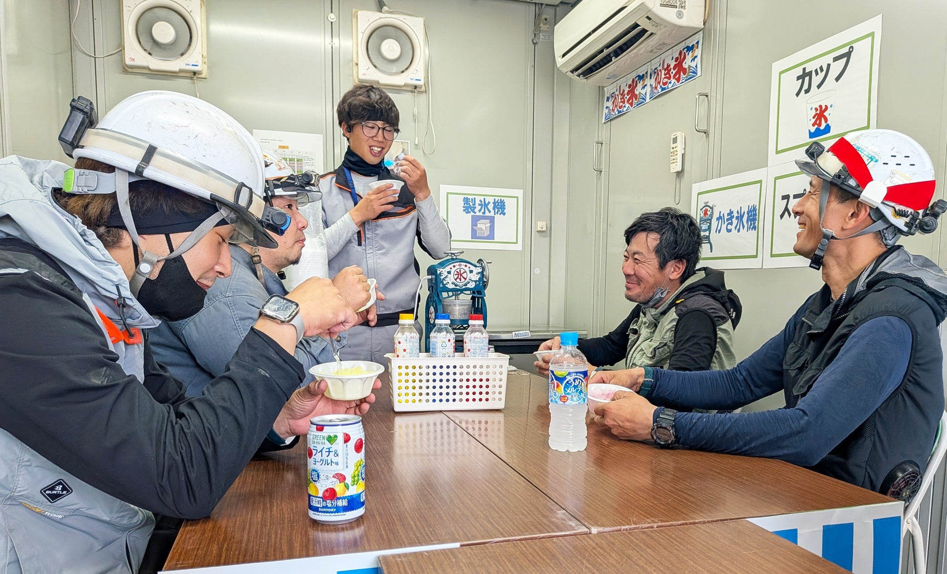 当時、出勤前にコンビニで氷を購入する作業員の姿を見た所長が、「現場に製氷機を設置すれば、負担も減り喜ばれるのでは?」と導入を決定。その後、「せっかく製氷機があるなら、かき氷も提供できるのでは?」と現場の声を受け、かき氷機も導入。作業員からも非常に好評を得て、以来、かき氷ステーションは三和建設の“夏の風物詩”となりました。