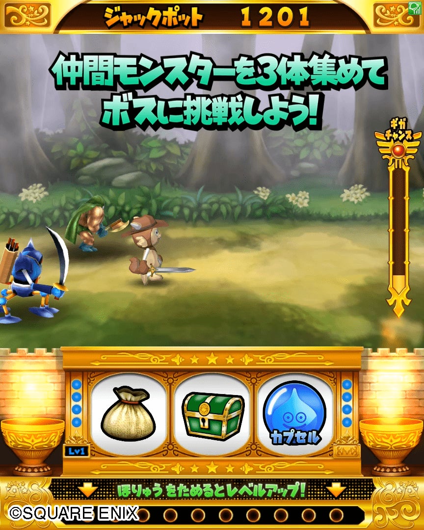 スロットを回しながらフィールド上にあるカプセルを落とすことによってモンスターを仲間にし、モンスター3体を集めてボスバトルに挑戦します。見事ボスを倒すとJACKPOTを含むルーレットに進むことができ、大量のメダルを獲得できるチャンスを得られます。各ルーレットはサテライト毎に搭載されたボールによる物理抽選機で行います。抽選待ち時間が発生せず、プレイヤーの興奮を途絶えさせる事なくスムーズにハラハラドキドキの臨場感をお楽しみいただけます。