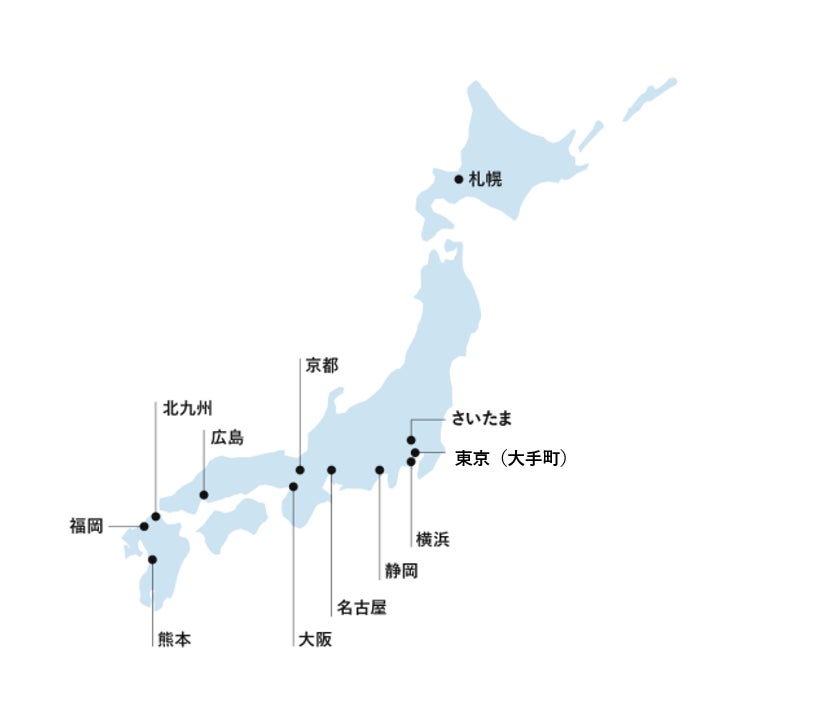 国内では、2010年に大阪、2011年に名古屋、2013年に福岡、2022年にさいたま、2023年に京都、2024年に横浜・熊本、2025年に静岡・広島・北九州に拠点を設置しました。