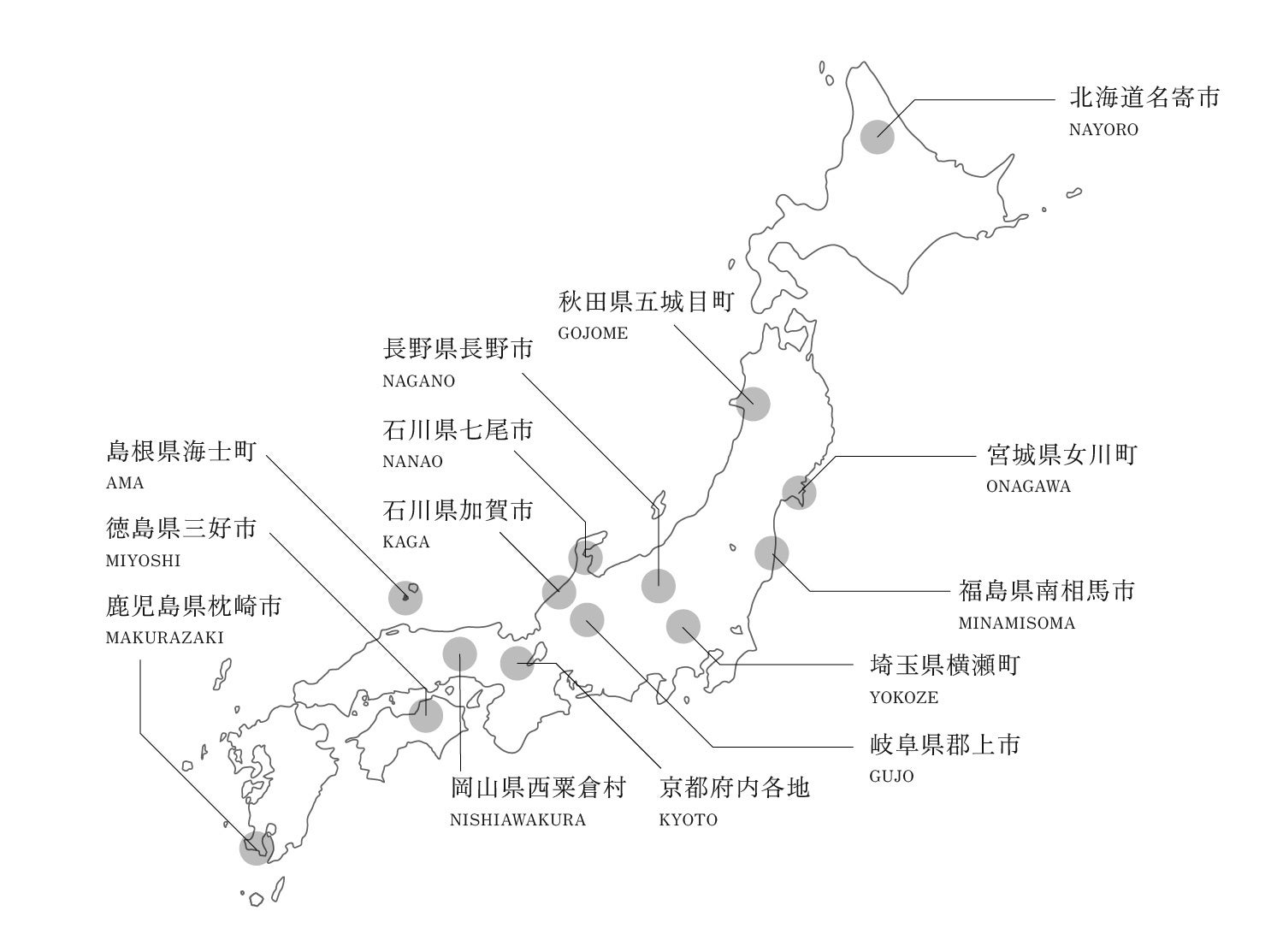 北海道名寄市、秋田県五城目町、宮城県女川町、福島県南相馬市、石川県加賀市、石川県七尾市、埼玉県横瀬町、長野県長野市、岐阜県郡上市、京都府内各地、島根県海士町、岡山県西粟倉村、徳島県三好市、鹿児島県枕崎市(2025年5月時点)