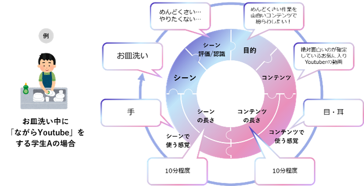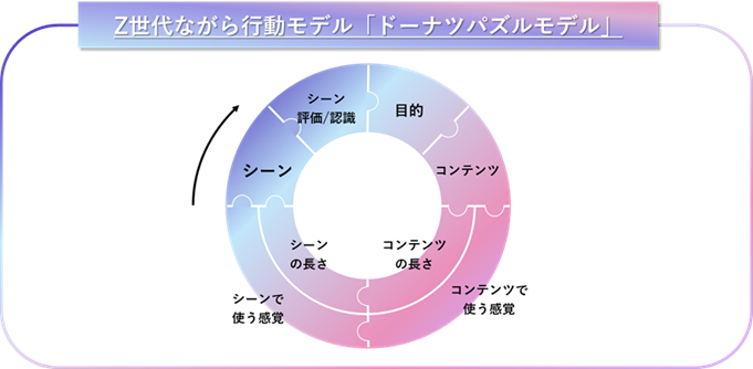 このモデルは、“ながら行動”を行う際に「シーン/目的/コンテンツ」の3要素を上記のようなドーナツ型のパズルがはまるように無意識的に決定しているという、Z世代特有の”ながら行動”様式を構造的に示したものです。
