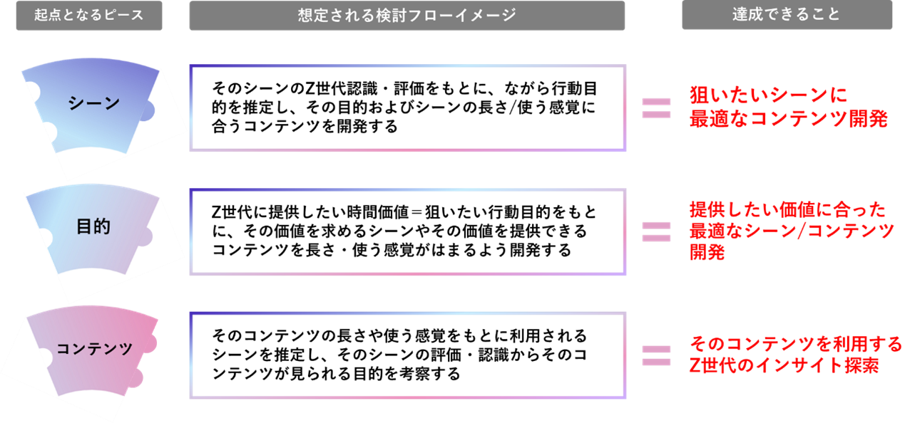 この「ドーナツパズルモデル」は1つのピースを起点にした際の最適な体験設計を検討する際に活用でき、「あるシーンにおける最適なコンテンツ設計」や「Z世代の行動目的に寄り添ったシーン開発/コンテンツ開発」など対Z世代の体験設計の道標になると考えています。