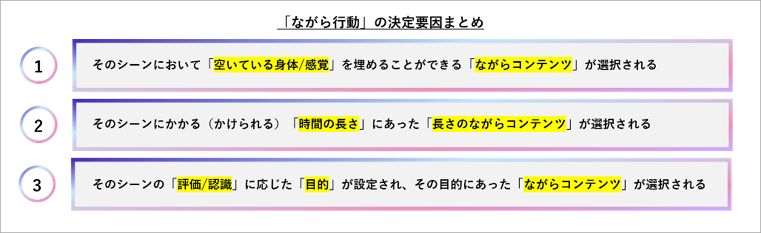 その結果、Z世代の”ながら行動”が行われる背景には、「シーン」「コンテンツ」「目的」という3要素に基づく以下の決定要因があることが明らかになりました。