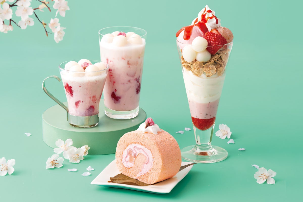 例年大好評の桜パフェ、桜ドリンクと、桜餅をイメージしたロールケーキが2/15より期間限定で販売開始。季節限定フードメニューは、3/1から。スパイスと野菜のカレーを春に味わう。