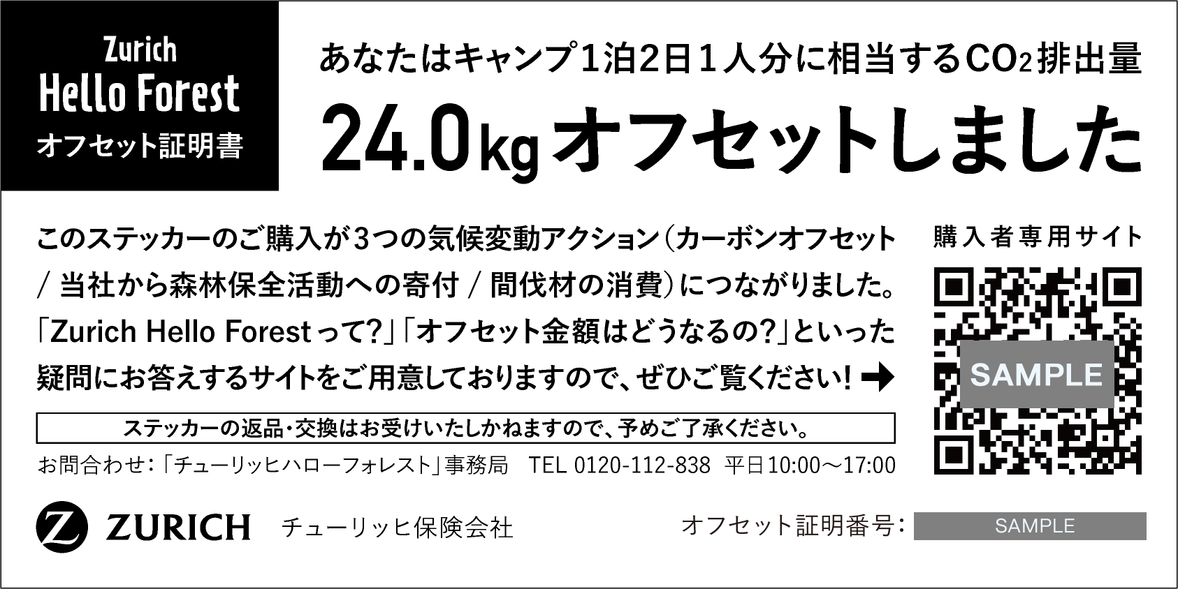 「チューリッヒ ハローフォレスト」は、キャンプを楽しむ方々が、キャンプ場で国産間伐材を使用したオリジナルステッカーを1枚300円で購入することにより、キャンプ1泊1人当たりが排出するCO2をオフセットできるものです。また、当社もお客さまのオフセット金額と同額を国内の森林保全活動へ寄付します。11月5日より、国内8カ所のキャンプ場でこのステッカーを数量限定販売します。気候変動に取組む当社が、キャンパーの皆さまが気候変動について考え、共に行動するきっかけづくりとしてご提供します。