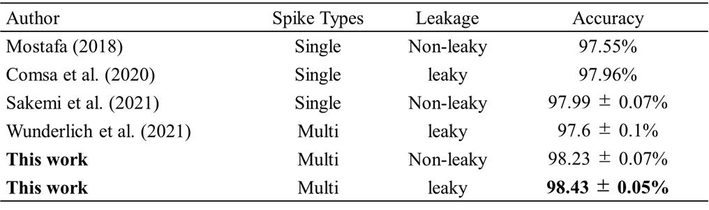 2層のSNNを用いた場合のMNISTデータセットにおける認識性能。Spike Typeについては、Singleは各ニューロンあたり最大一回の発火制約 (TTFSコーディング)を表し、Multiは複数回発火が可能な場合を表す。
