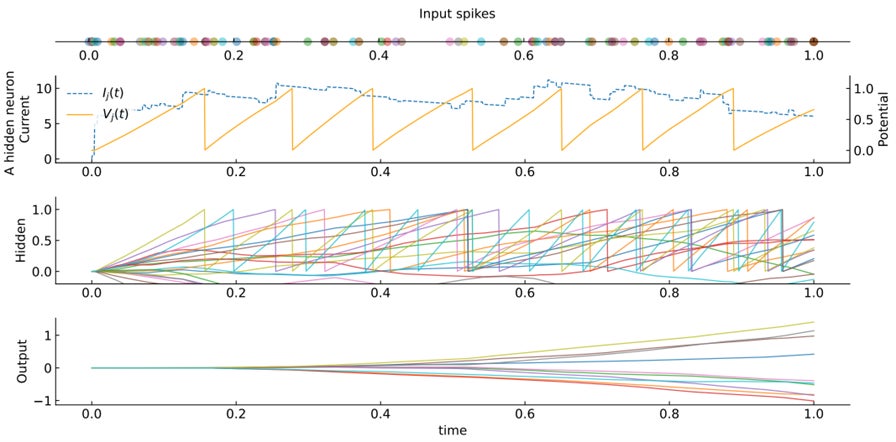 隠れ層を一層持つ学習後のSNNの時間発展を示している。最上段の図は発火時刻に符号化された入力スパイクの時刻をプロットしている。上から2番目の図は、ある隠れ層ニューロンの膜電位(橙色実線)とシナプス電流(青色破線)の時間発展を示している。ニューロンは発火後もシナプス電流を保存し、複数回発火している。上から3番目の図は、複数の隠れ層ニューロンの膜電位の時間発展を示している。最下段の図は、出力層ニューロンの膜電位の時間発展を示しており、処理終了時刻(この場合t=1.0)の各出力層ニューロンの膜電位を出力値としている。このモデルでは、出力層が発火しないことに留意されたい。
