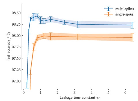 提案した学習手法によって実現される複数回発火可能なモデル (multi-spikes)と、単一発火に制限された従来モデル (single-spike)の性能を比較している。特に、リーク定数の変化による各モデルの性能を比較している。