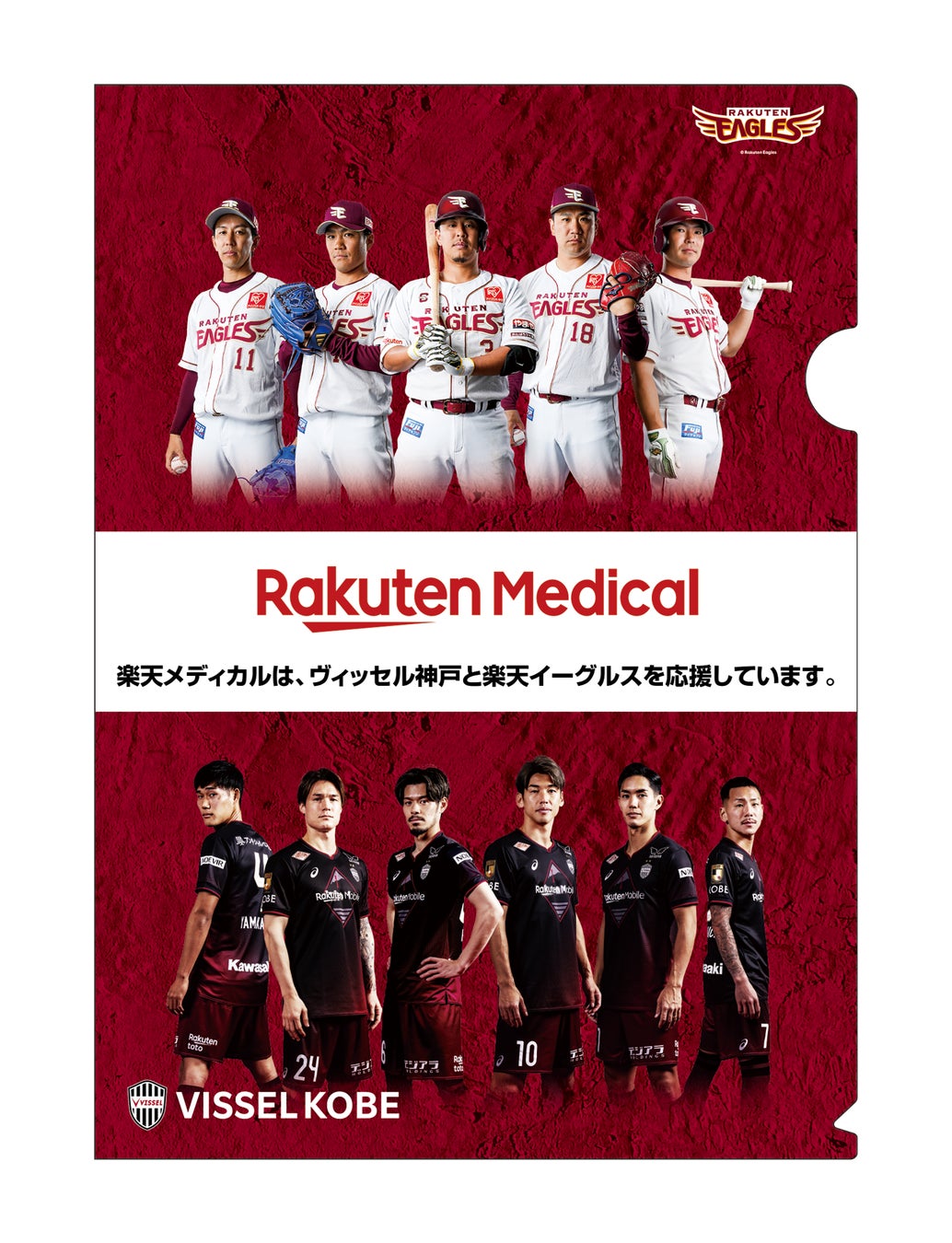 楽天メディカルのパートナーであるJ1リーグ所属のサッカークラブ「ヴィッセル神戸」と、同社がオフィシャルスポンサーを務めるプロ野球チーム「東北楽天ゴールデンイーグルス」の選手を起用した、頭頸部がん啓発クリアファイルを日本頭頸部癌学会監修のもと作成予定です。