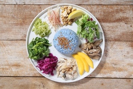 カオヤムとは、カオ(ご飯)をヤム(混ぜる)という意味のタイ風ライスサラダ。バタフライピーで色付けた鮮やかなライスに、焼き鯖、フレッシュマンゴー、デュカナッツなどの10種具材で彩られたビジュアル系ライスサラダプレート。タマリンドドレッシングをかけて。