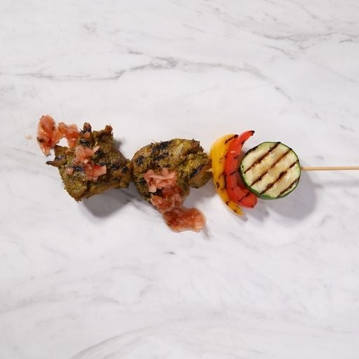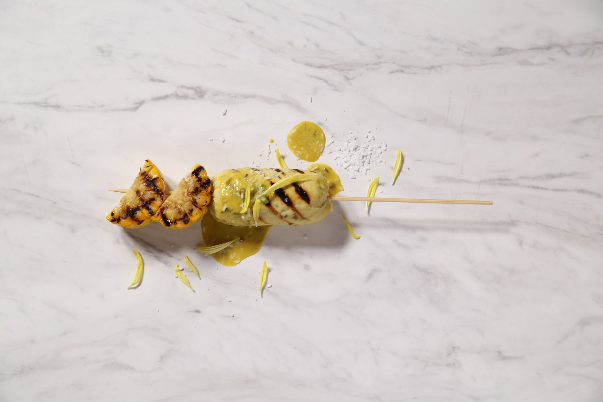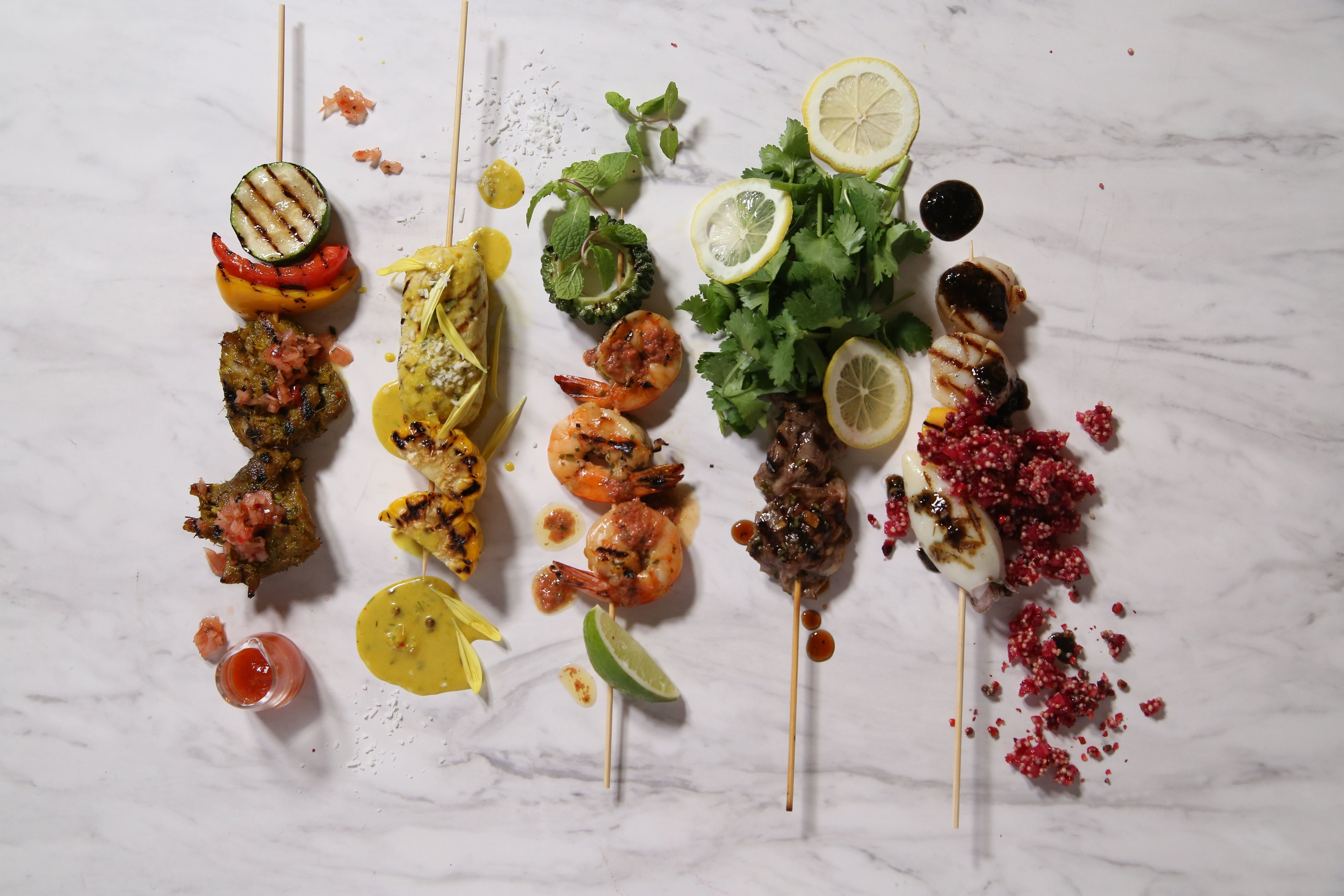 鶏肉を本国のオリジナルレシピのレモングラス、カフィアライムなどのハーブやスパイスでマリネし、ズッキーニ、2色のパプリカとともに香ばしく焼き上げたプラタランのシグネチャー串焼き。