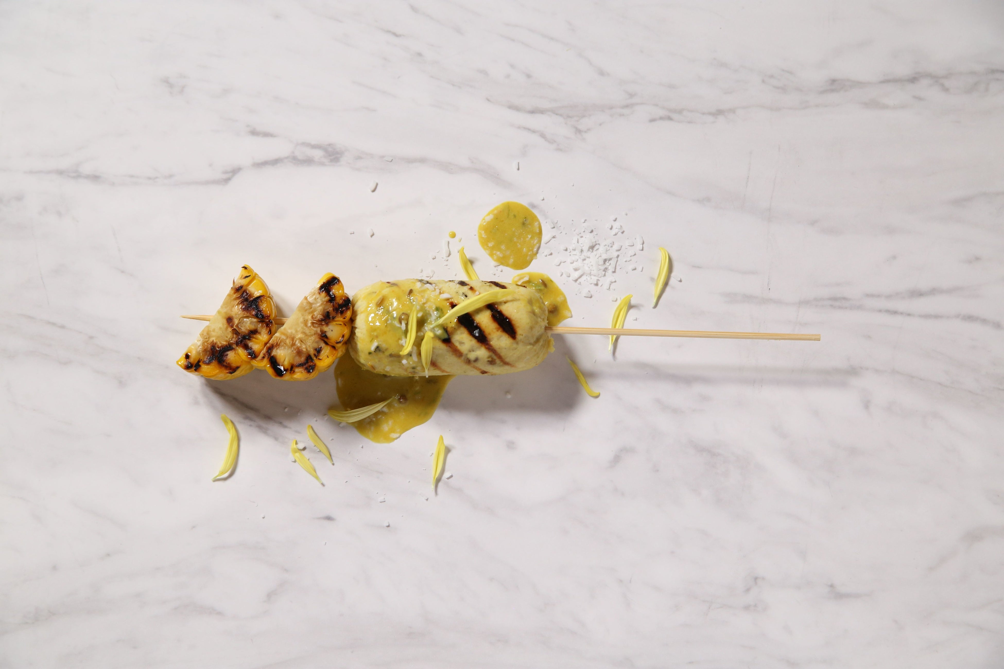 オリジナルブレンドスパイスで香りをつけた鶏つくねに、バターチキンカレーソース、ココナッツ、焼きとうもろこしを合わせて仕上げ、「夏のバターチキンカレー」を串にアレンジ。
