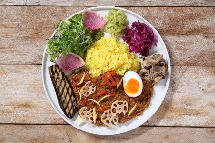 オリジナルブレンドスパイスの香り高いビーフキーマカレーに、ターメリックライス、ナスのグリル、3種のデリ(レッドキャベツ、セロリ、キノコ)、ボイルドエッグ、ハーブサラダを盛り合わせたグッドルッキングカレープレート。