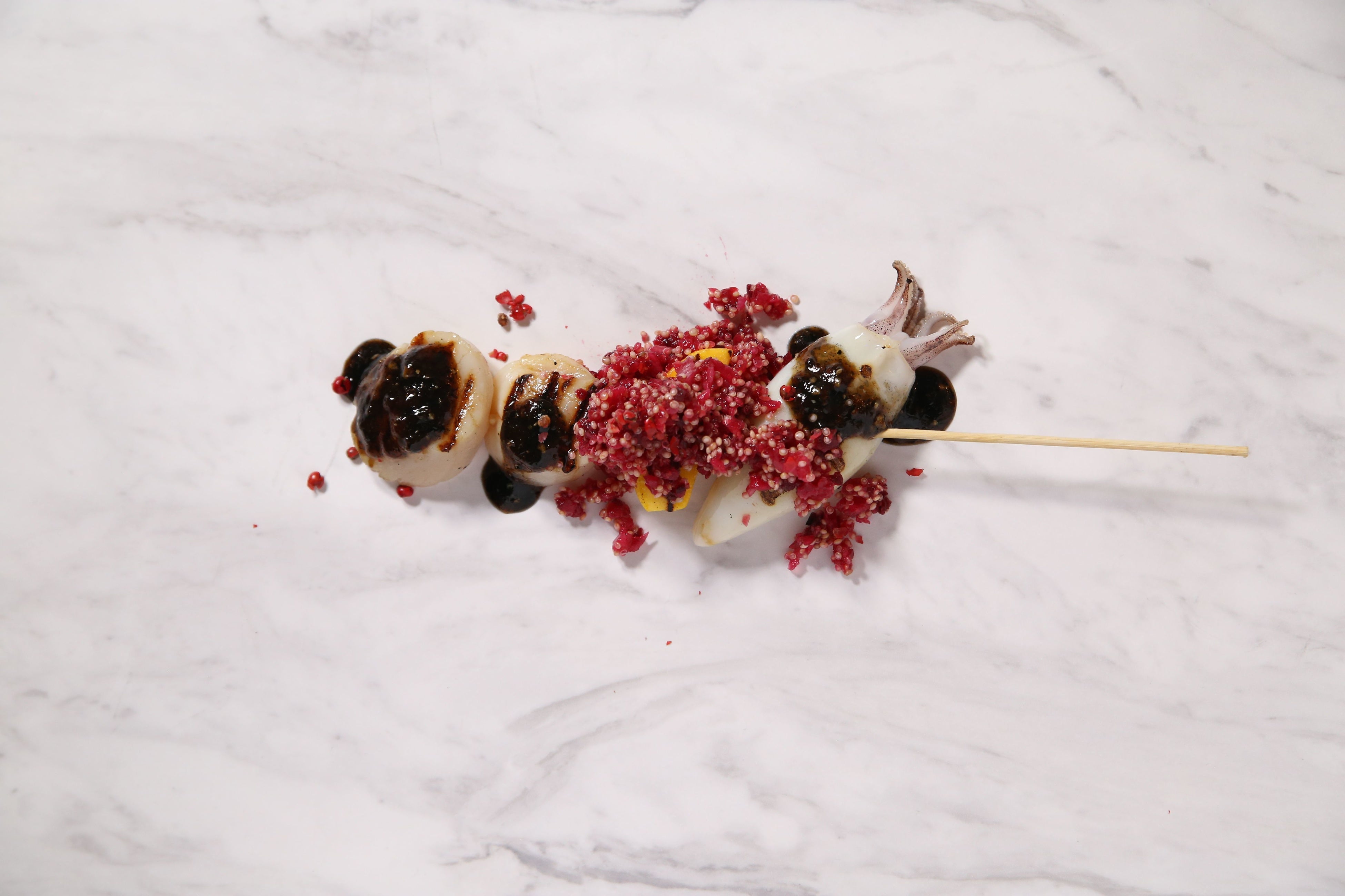 ホタテ、ヤリイカ、マンゴーの串焼きに、スーパーフードのキヌアやビーツ、紅芯大根などで作ったピンク色のタブレ、シンガポールで人気のブラックペッパーソースをかけて仕上げたアレンジシーフード串焼き。