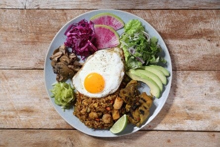 プラタランシグネチャーのナシゴレンに、レモングラス、カフィアライなどのハーブやスパイスでマリネして香ばしく焼き上げたグリルチキン、フライドエッグ、アボカド、3種のデリ(レッドキャベツ、セロリ、キノコ)、ハーブサラダを盛り合わせたデリ&ライスプレート。