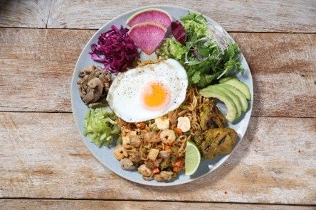 プラタランシグネチャーのミーゴレンに、レモングラス、カフィアライなどのハーブやスパイスでマリネして香ばしく焼き上げたグリルチキン、フライドエッグ、アボカド、3種のデリ(レッドキャベツ、セロリ、キノコ)、ハーブサラダを盛り合わせたデリ&ライスプレート。