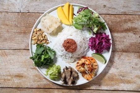 特製の海老味噌ソースをのせたベトナムの米細麺ブンを中心に、レモングラスやナンプラーでマリネしグリルしたトムヤムシュリンプ、レンコンと白キクラゲのマリネ、フレッシュマンゴー、パクチーなど、色とりどりの野菜やハーブをパレットのように盛り付けた、ヘルシーで罪悪感なく食べられるなサラダヌードルプレート。