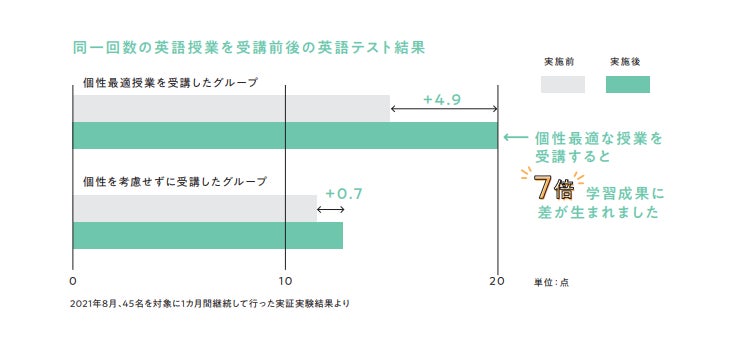 一方凸版印刷では、子どもの個性に合わせた教育の提供を目指し、2018年に子どもの適性を8つの脳力指標に分類する個性診断を開発しました。その活用範囲の拡大にあたり、スパトレと実証実験を行って参りました。2021年8月に実施した実証実験では、個性診断の結果に合わせた授業を受講したグループとそうでないグループでは学習定着度に7倍の差があることが実証されました。