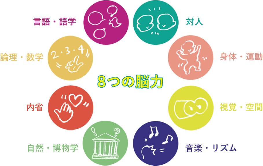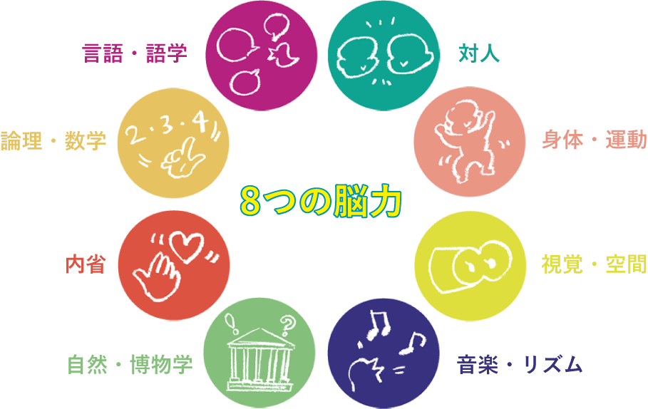 1980年代にハーバード大学・ハワードガードナー博士が提唱した知性の8分類を始め、最新の心理学や脳科学の知見を集約し、早稲田大学の本田恵子教授の協力のもと開発された知能の発展度合いを可視化するアセスメントです。