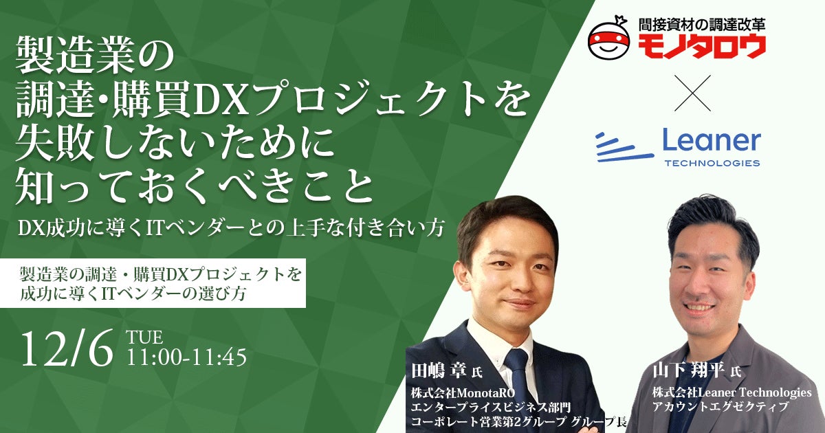 調達管理プラットフォーム「Leaner見積」を提供する株式会社Leaner Technologies(本社:東京都品川区、代表取締役:大平裕介)は、製造業の調達・購買DXをテーマに株式会社MonotaRO(本社:兵庫県尼崎市、代表取締役社長:鈴木雅哉)と共同で無料オンラインセミナーを開催することをお知らせいたします。