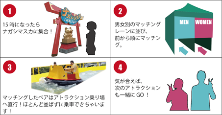 1.アトラクション前に設置された「マッチングレーン」に男女それぞれの入口からお並び頂きます。