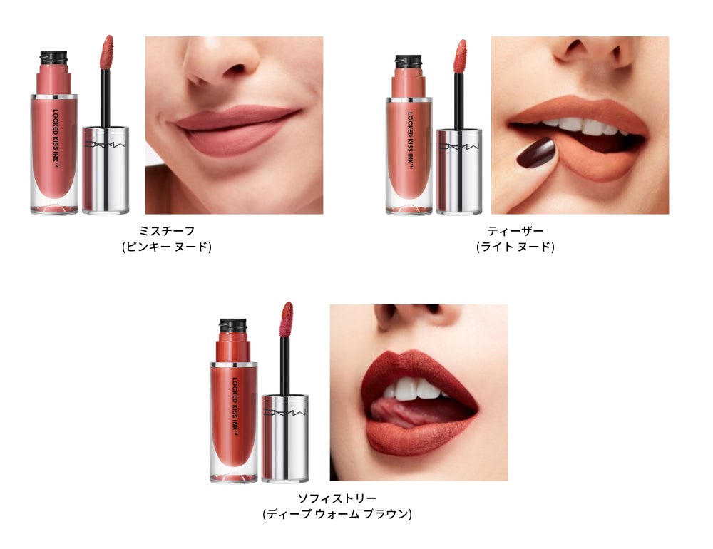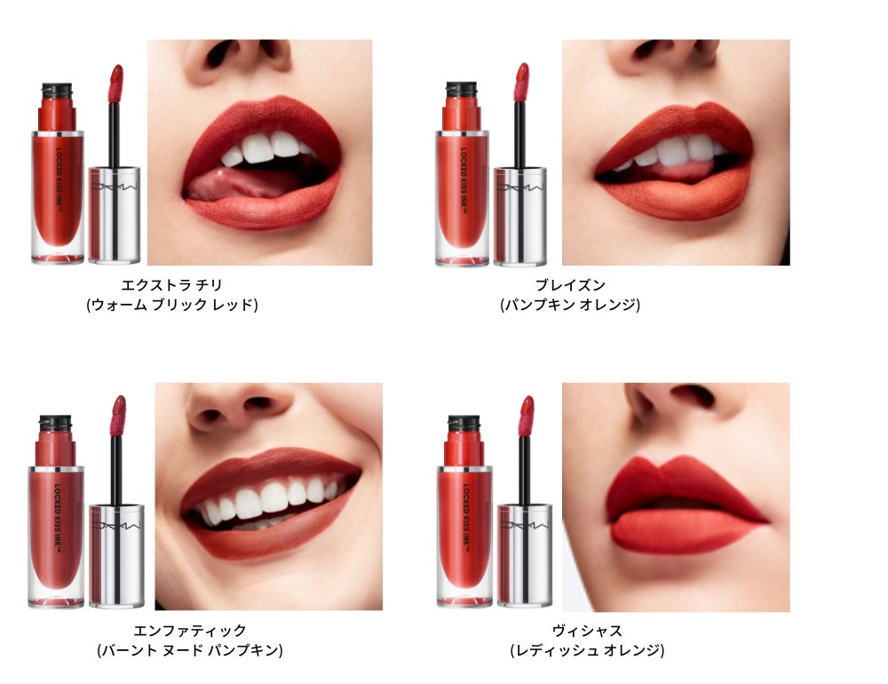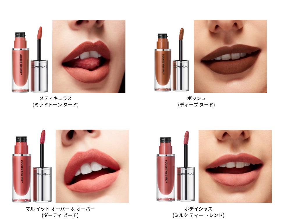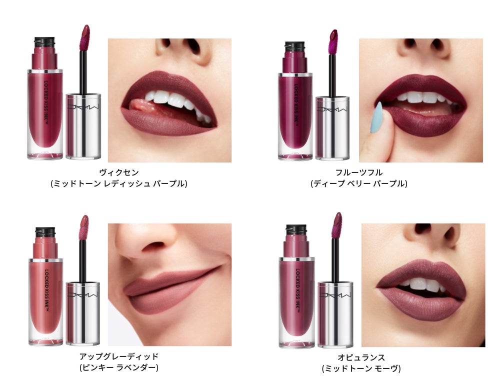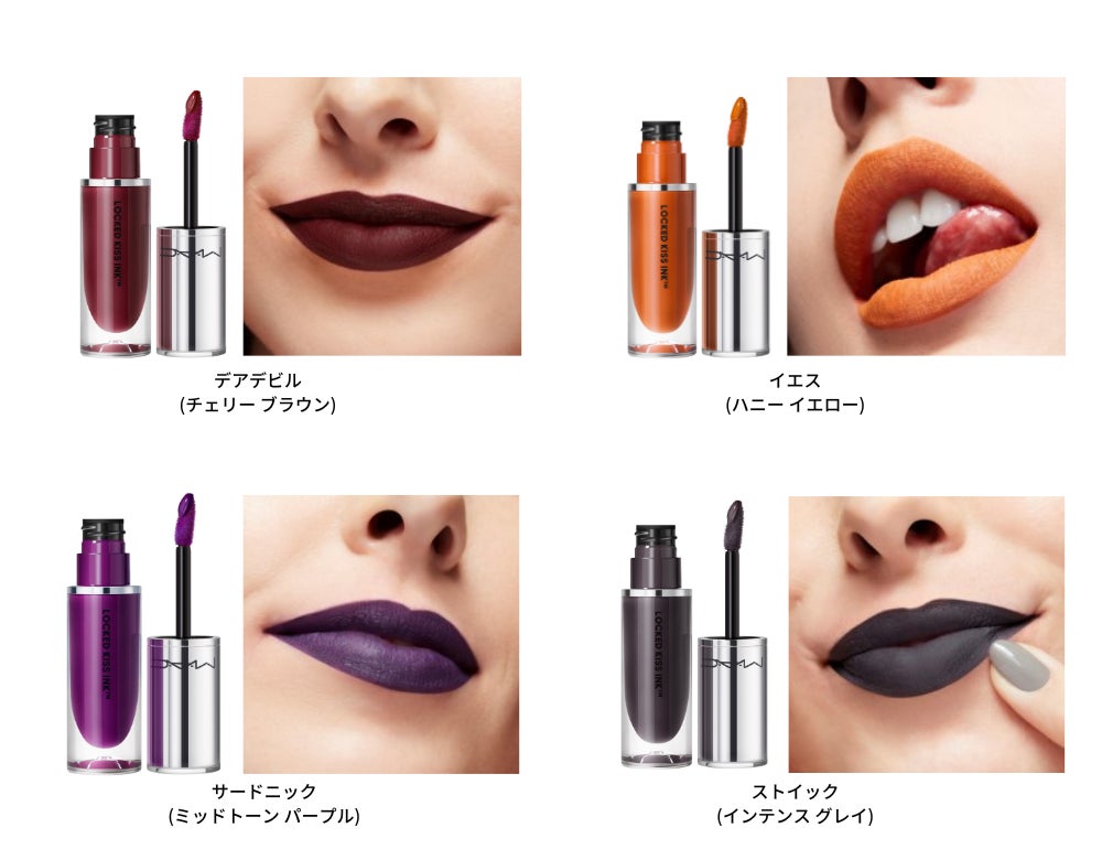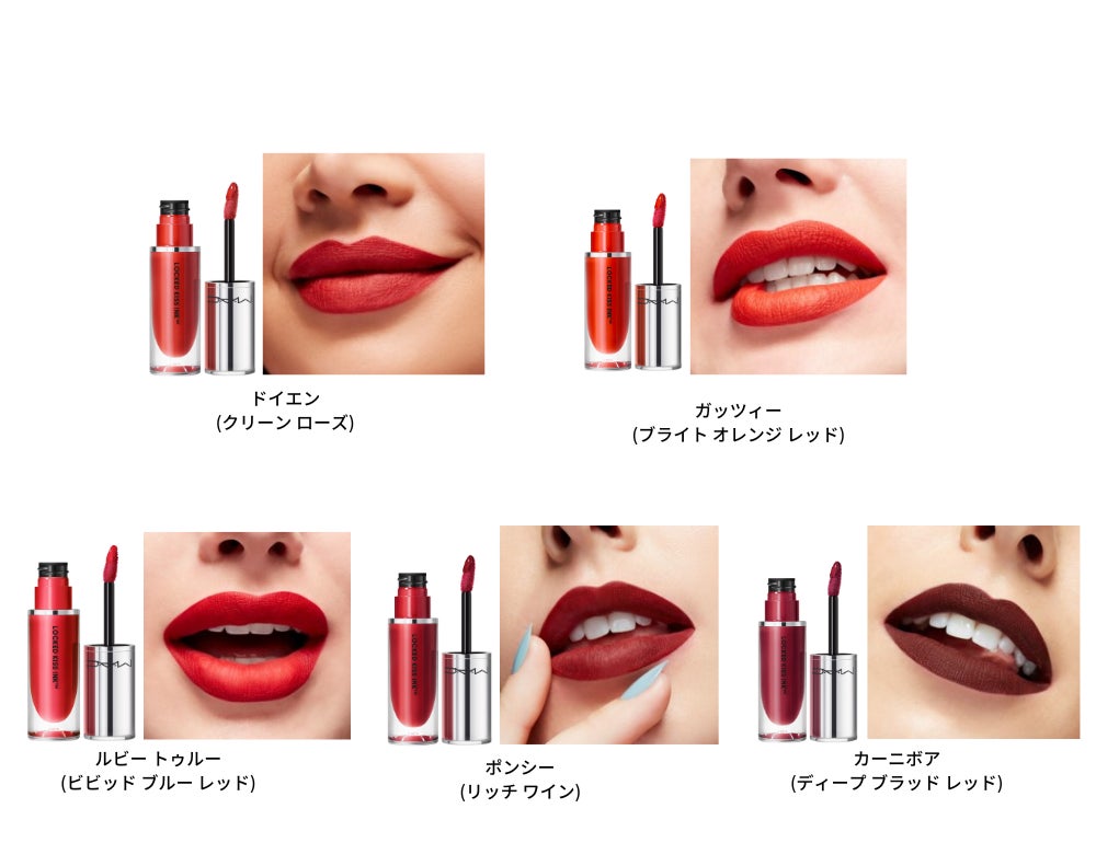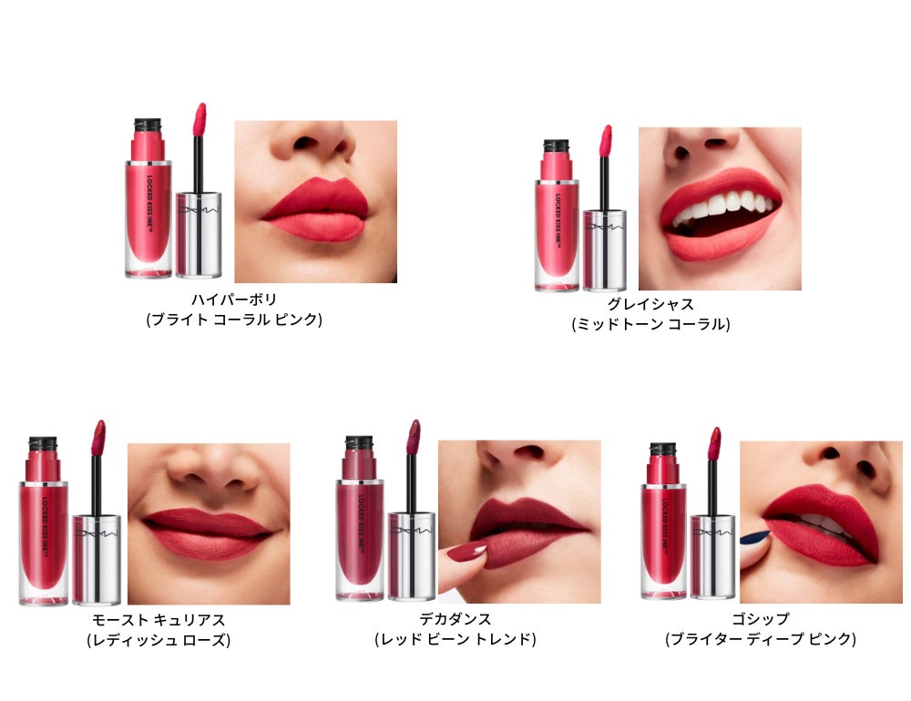 「まさに待ち望んでいたリップフォーミュラです!贅沢なほど滑らかで伸びが良く、美しい発色。M・A・C ロックド キス インク リップカラーは、あらゆる年齢、様々なスキントーンに合わせやすい豊富なシェード展開で、ゴージャスな口元を演出します。すべての年齢・肌色・個性に映える色合いで、つけたてのフレッシュな美しさを保ちます。まさに究極のエフォートレスなリップカラーであり、美の世界を震撼させること間違いなしです」