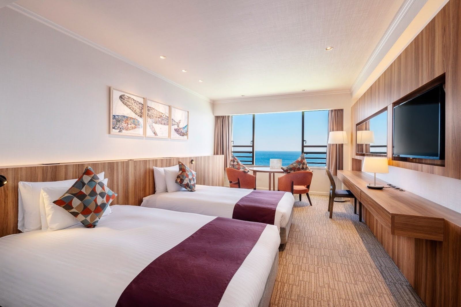 「ホテルニューアカオ」は、2023年に復活した熱海の人気ホテル。350室28タイプの客室は全室オーシャンビュー、どこまでも広がる海と空が一望できます。