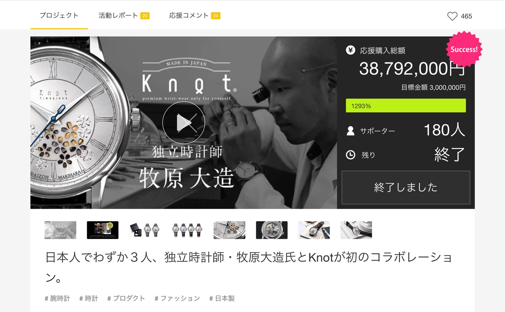 2018年:Makuake クラウドファンディングプロジェクト「Knotが日本の時計製造業の未来を支援する。若き技術者がデザインした特別モデル」