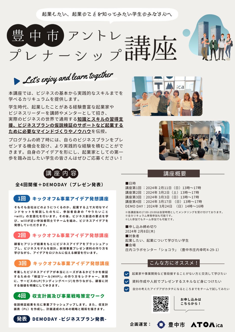 ソーシャルコワーキングスタートアップの株式会社ATOMica(本社:宮崎県宮崎市、代表取締役:嶋田 瑞生、南原 一輝、以下ATOMica)は、大阪府豊中市から運営業務を受託し、2024月2月11日(日)から、『豊中市アントレプレナーシップ講座』を実施。
