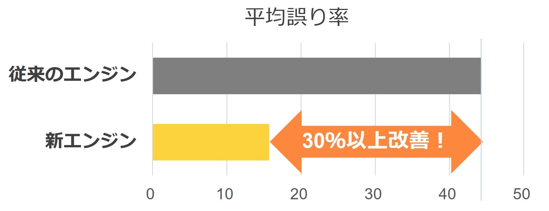 従来のエンジンと新エンジンを比較した自社性能評価の結果、新エンジンでは平均誤り率が大幅に改善されました。特に「人名」「住所」「短文」の3シーンで、30%以上の誤り率改善※を確認できています。
