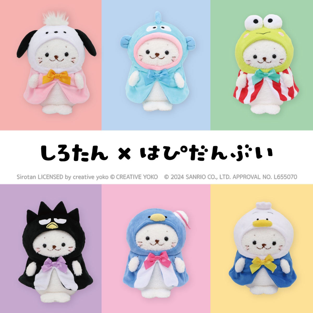 この度開催する京都駅、大宮駅でのポップアップストアでは、『しろたん』とサンリオキャラクターズのコラボ商品「しろたん×はぴだんぶい」のぬいぐるみを数量限定で販売します。『しろたん』がポチャッコ、タキシードサム、けろけろけろっぴ、バッドばつ丸、ハンギョドン、あひるのペックルの個性あふれる6人に変身したぬいぐるみで、『しろたん』のふわふわな世界観と「はぴだんぶい」の魅力が詰まったアイテムです。また、『しろたん』の干支シリーズやクリスマスシリーズの販売も行います。皆さまのご来場をお待ちしております。
