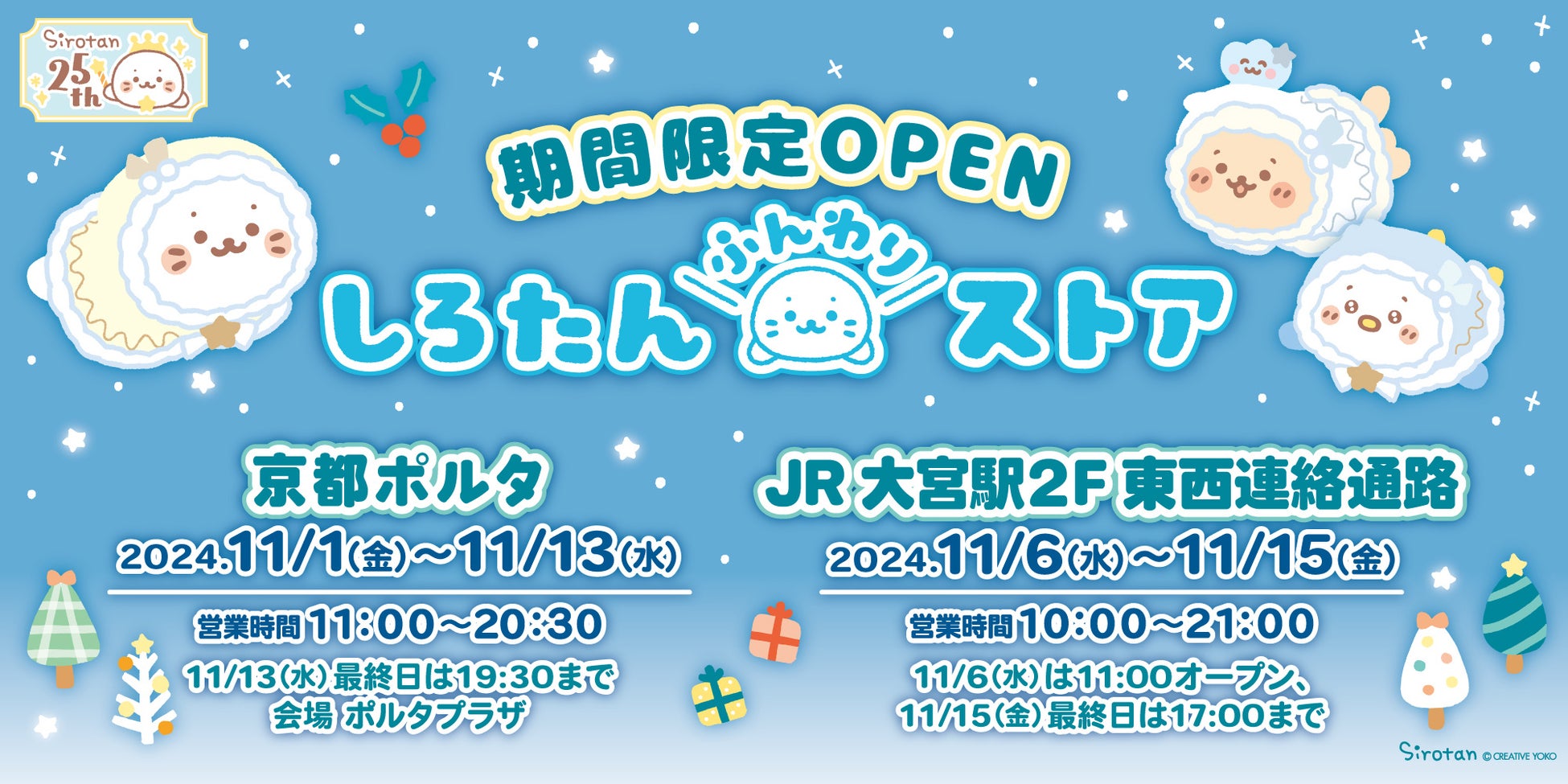 株式会社クリエイティブヨーコ(本社:長野県長野市 代表取締役社長:北原 武幸)は、ポップアップストア「しろたんふんわりストア」を、11月1日(金)より京都駅前地下街ポルタ、11月6日(水)よりJR大宮駅2F東西連絡通路にて期間限定でオープンし、しろたん×サンリオキャラクターズコラボ商品を数量限定で販売します。