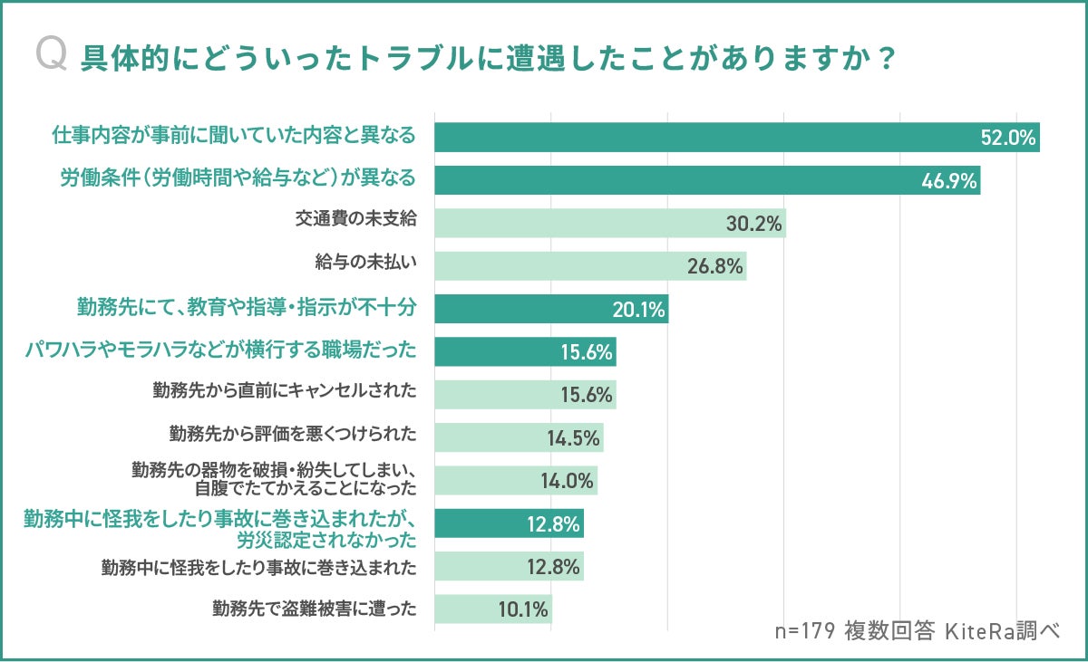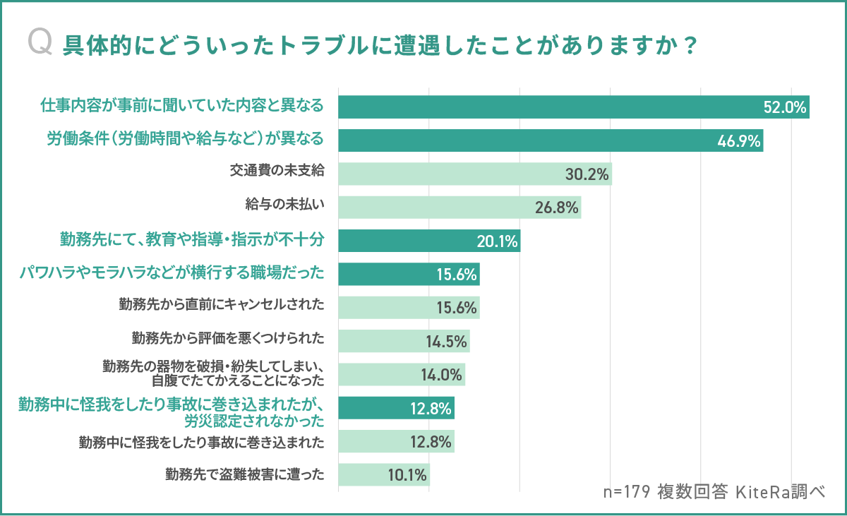 「はい」と回答した人に対し、具体的にどのようなトラブルに遭遇したことがあるか聞いたところ、「仕事内容が事前に聞いていた内容と異なる」と回答した人が52.0%で最多、次いで「労働条件(労働時間や給与など)が異なる」が46.9%。他、「教育や指導・指示が不十分」が20.1%、「パワハラやモラハラが横行する職場だった」が15.6%、「勤務中に怪我や事故に巻き込まれたが労災認定されなかった」が12.8%との結果に。