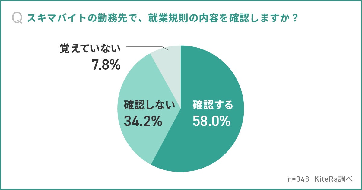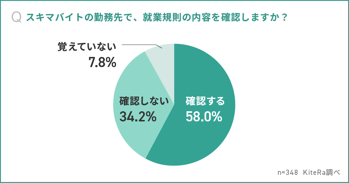 「スキマバイトの勤務先で、就業規則の内容を確認しますか」と質問したところ、「確認する」と回答した人は58.0%で、「確認しない」が34.2%、「覚えていない」が7.8%との結果に。
