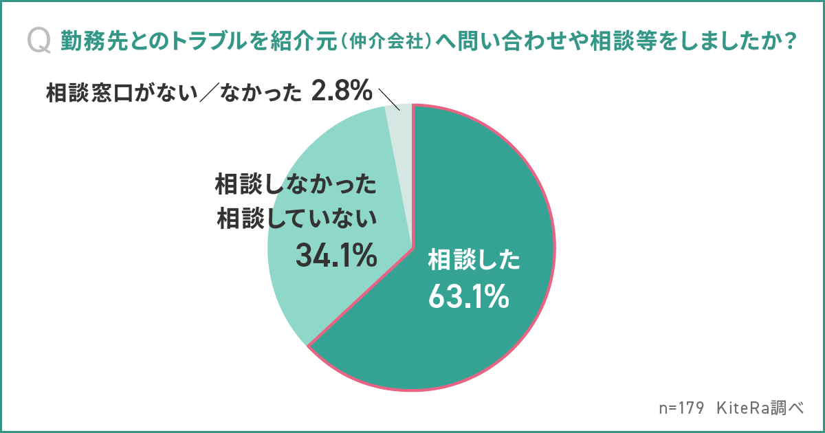 「勤務先でトラブルに遭ったことがありますか」と質問し「はい」と回答した人に対し、「勤務先とのトラブルを紹介元(仲介会社)へ問い合わせや相談等をしましたか」と質問したところ、「相談した」と回答した人が63.1%、「相談しなかった/相談していない」が34.1%、「相談窓口がない/なかった」が2.8%との結果に。