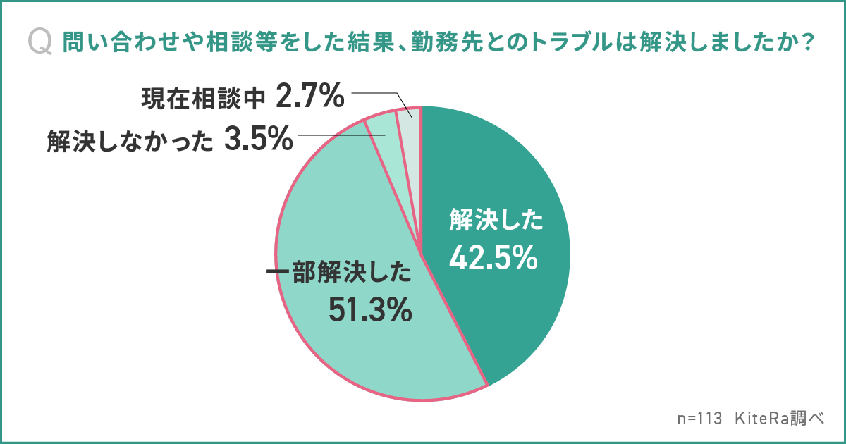 「相談した」と回答した人に、「問い合わせや相談等をした結果、勤務先とのトラブルは解決しましたか」と質問したところ、「解決した」と回答した人は42.5%、「一部解決した」が51.3%、「解決しなかった」が3.5%、「現在相談中」が2.7%との結果に。未だ解決していない人が57.5%いることが判明した。