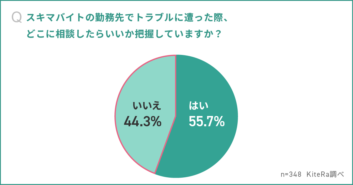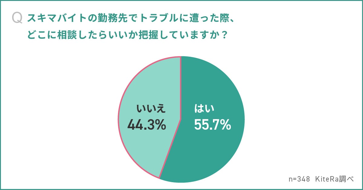 「スキマバイトの勤務先でトラブルに遭った際、どこに相談したらいいか把握していますか」と質問したところ、「いいえ」と回答した人は44.3%、「はい」が55.7%との結果に。相談先を十分に周知できていない企業や仲介会社のサポート体制不足がうかがえます。
