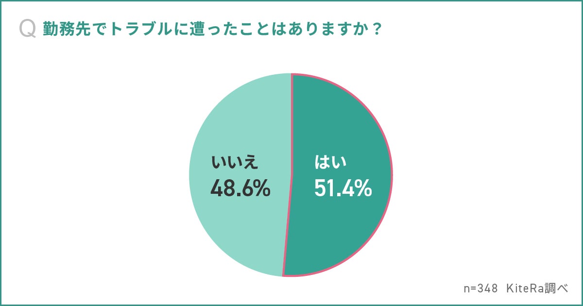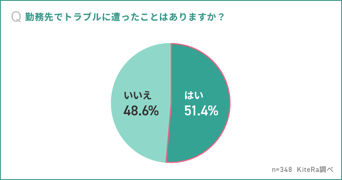 「勤務先でトラブルに遭ったことがありますか」との質問に対し、「はい」と回答した人が51.4%。半数以上の人がトラブルに遭ったことがあることが判明した。