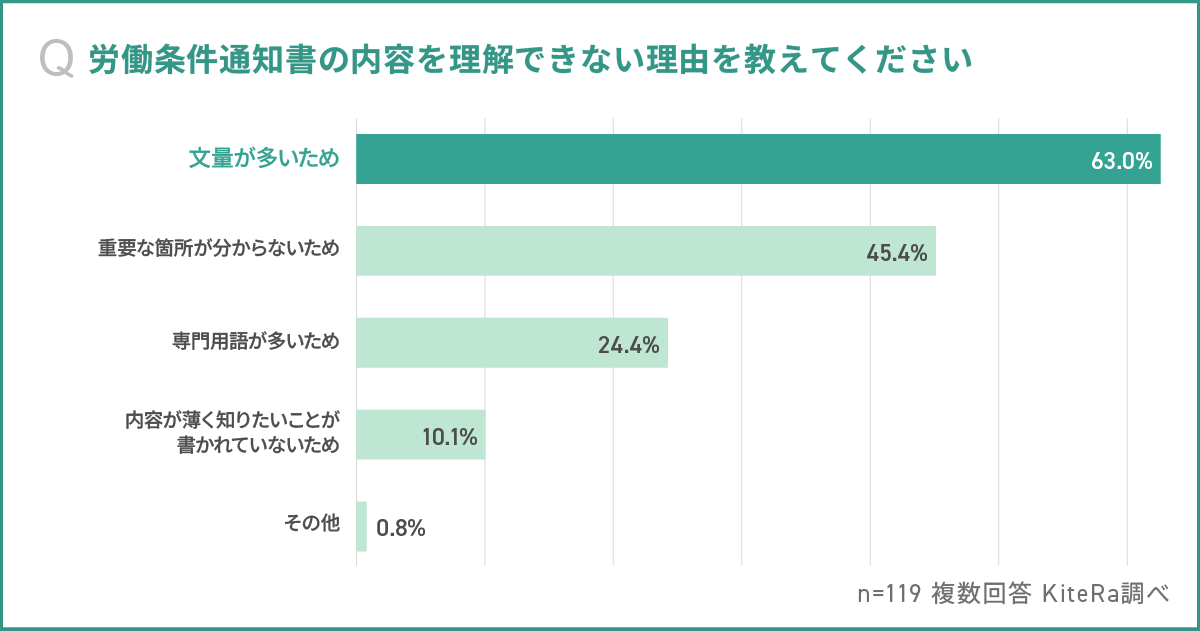 さらに、労働基準法ではスキマバイトにも労働条件通知書を交付する必要があるとされていますが、仕事を開始する際に勤務先から労働条件通知書が送られて来なかった経験がある人が5割以上いることが分かりました。一方で、1割弱が労働条件通知書の内容を全く読まず、3割以上が読んでも内容を理解できないと回答し、その理由として最も多かったのは文量が多いためでした。