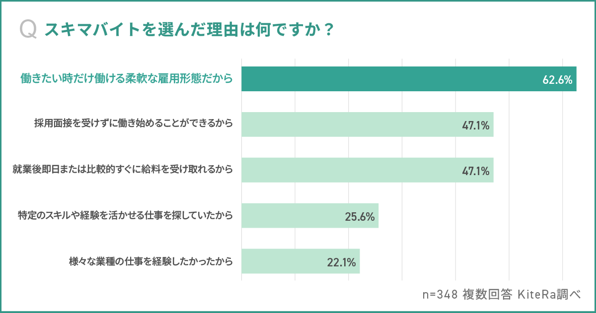 「スキマバイトを選んだ理由は何ですか」と質問したところ、最多の回答は「働きたい時だけ働ける柔軟な雇用形態だから」が62.6%、次いで「採用面接を受けずに働き始めることができるから」と「就業後すぐに給料を受け取れるから」が47.1%だった。